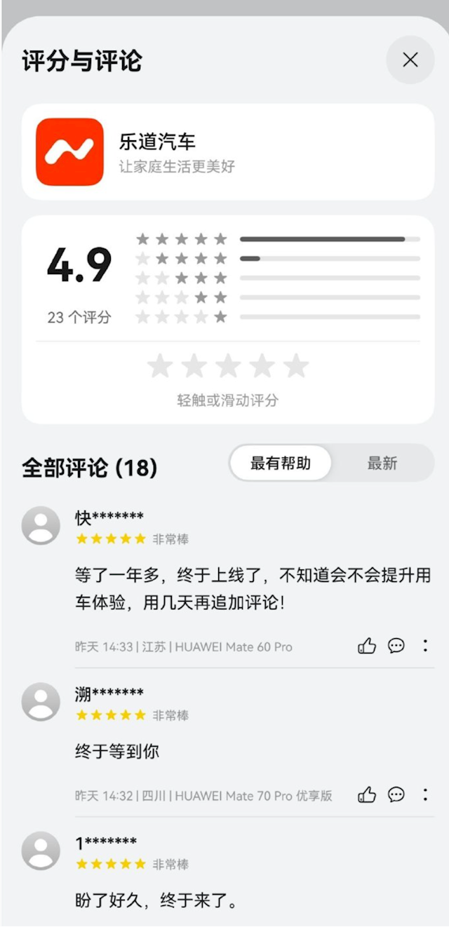 消息发布后,华为应用市场的乐道汽车App评论区已有多条用户留言,内容包括 “等了一年多,终于上线了,不知道会不会提升用车体验,用几天再追加评论!”、“终于等到你”等。