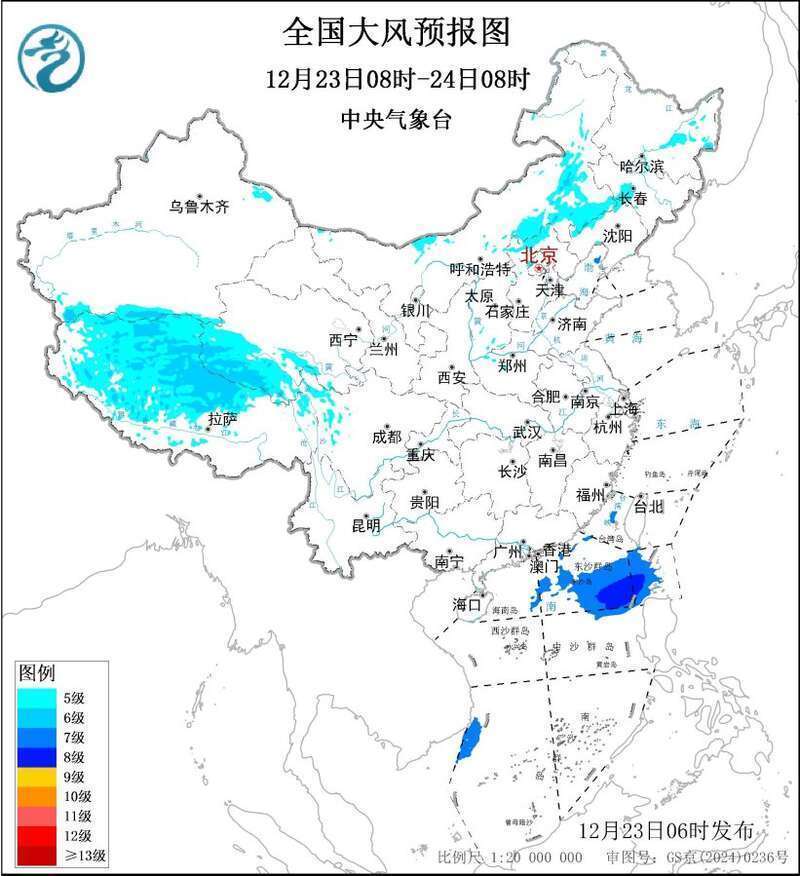 预计,12月23日08时至24日08时,内蒙古中东部、华北北部、黑龙江中东部、吉林西部、辽宁北部及辽东半岛、新疆北疆东部及南疆盆地山区、青海南部、西藏中北部等地有5~6级风,阵风7~8级;巴士海峡、南海东北部将有7~8级、阵风9级的大风,渤海东北部局地海域将有7级、阵风8级的大风。